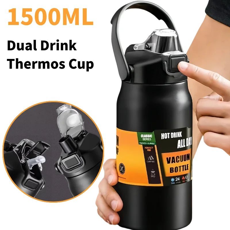 Stay hydrated anywhere with this Stainless Steel Thermal Sports Bottle, designed to keep your drinks perfectly hot or cold for hours. Made from high-quality 304 stainless steel, it ensures durability, safety, and long-lasting insulation performance. With a 1500ML large capacity, it’s ideal for workouts, travel, hiking, or daily use. The vacuum-sealed design maintains your beverage’s temperature—keeping water icy cold or coffee piping hot. Equipped with a built-in straw and leakproof lid, it allows for convenient, spill-free sipping on the go. Sleek, portable, and eco-friendly, this thermal bottle combines style, functionality, and performance for an active lifestyle.